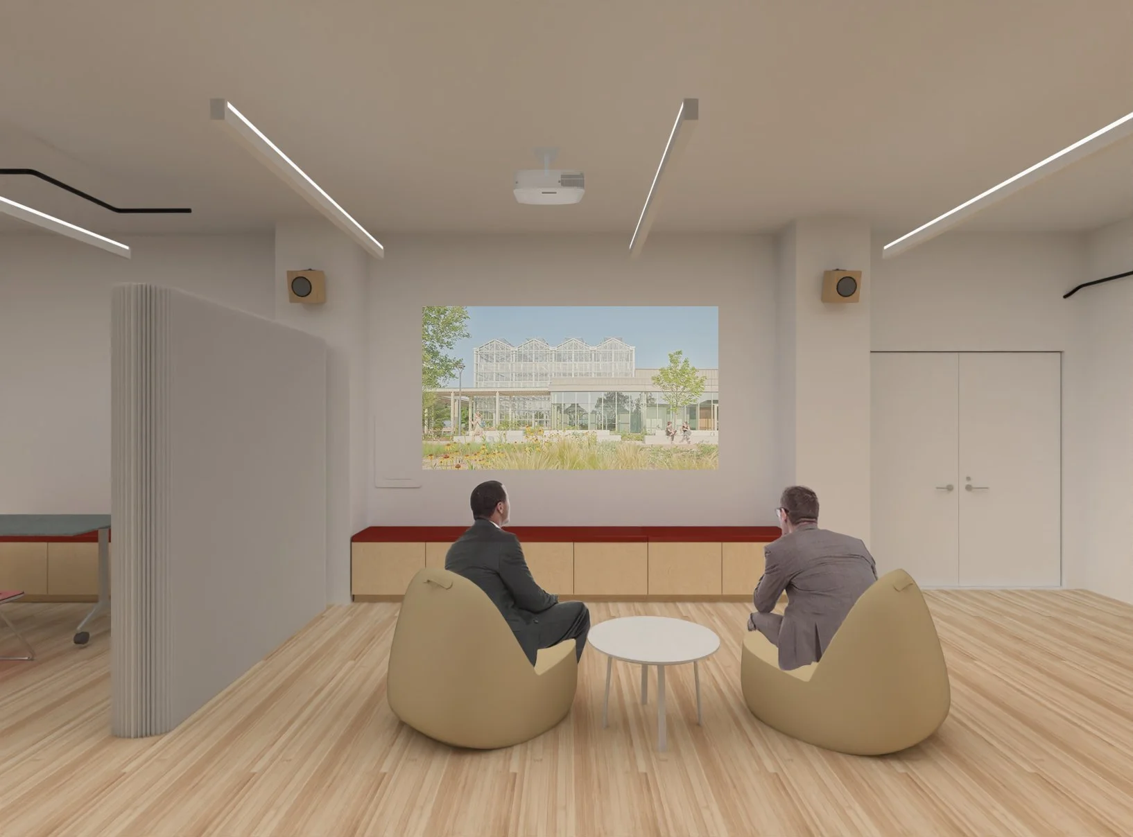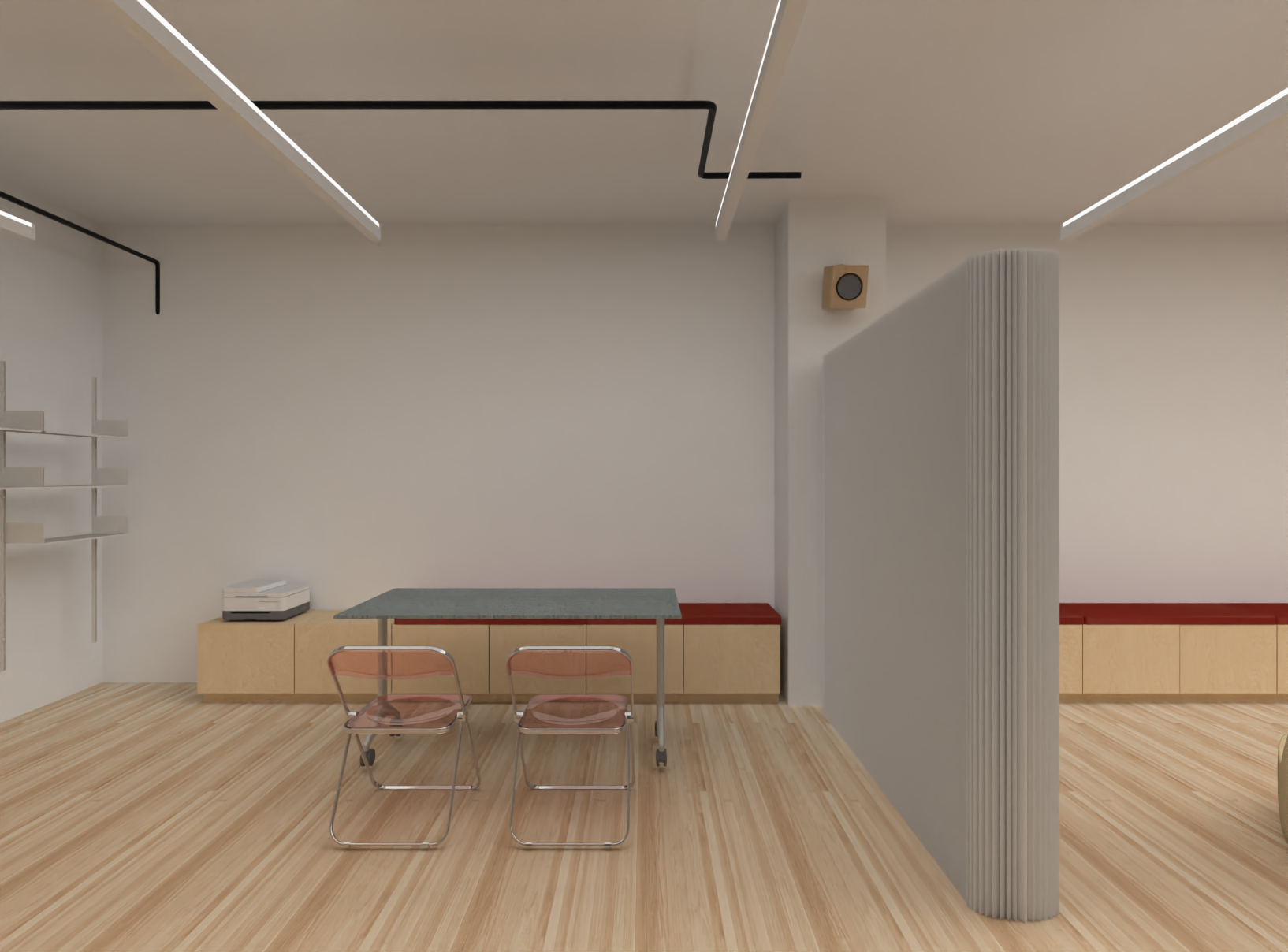 This ongoing project involves the gut renovation of a 1,160-square-foot office and its integration into the existing headquarters. The redesign expands Novità’s New York workspace with six new desks, a larger 20-person conference room, small breakout rooms, and a flexible “flux” space for visiting employees, events, and small exhibitions. A central design challenge was accommodating a wide range of functions within a compact footprint while ensuring connectivity to natural light. The proposal creates a balance between collaborative and private zones, enhancing both team productivity and individual focus.
